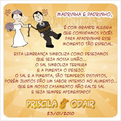 As vezes sinto-me um pouco antecipada em alguns itens da preparação do meu casamento, mas aí pessoas me dizem "que nada, você está certa, quanto antes melhor, até pra ter noção do quanto vai gastar e se preparar" ... pensando nisto, já estou olhando uns modelinhos diferentes e especiais para os nossos padrinhos - amigos, tios, primos e irmãos - afinal, são pessoas que tem participações especiais na nossa história juntos e com isso poderão testemunhar o início de uma grande vida juntos - Fernanda e Enderson.